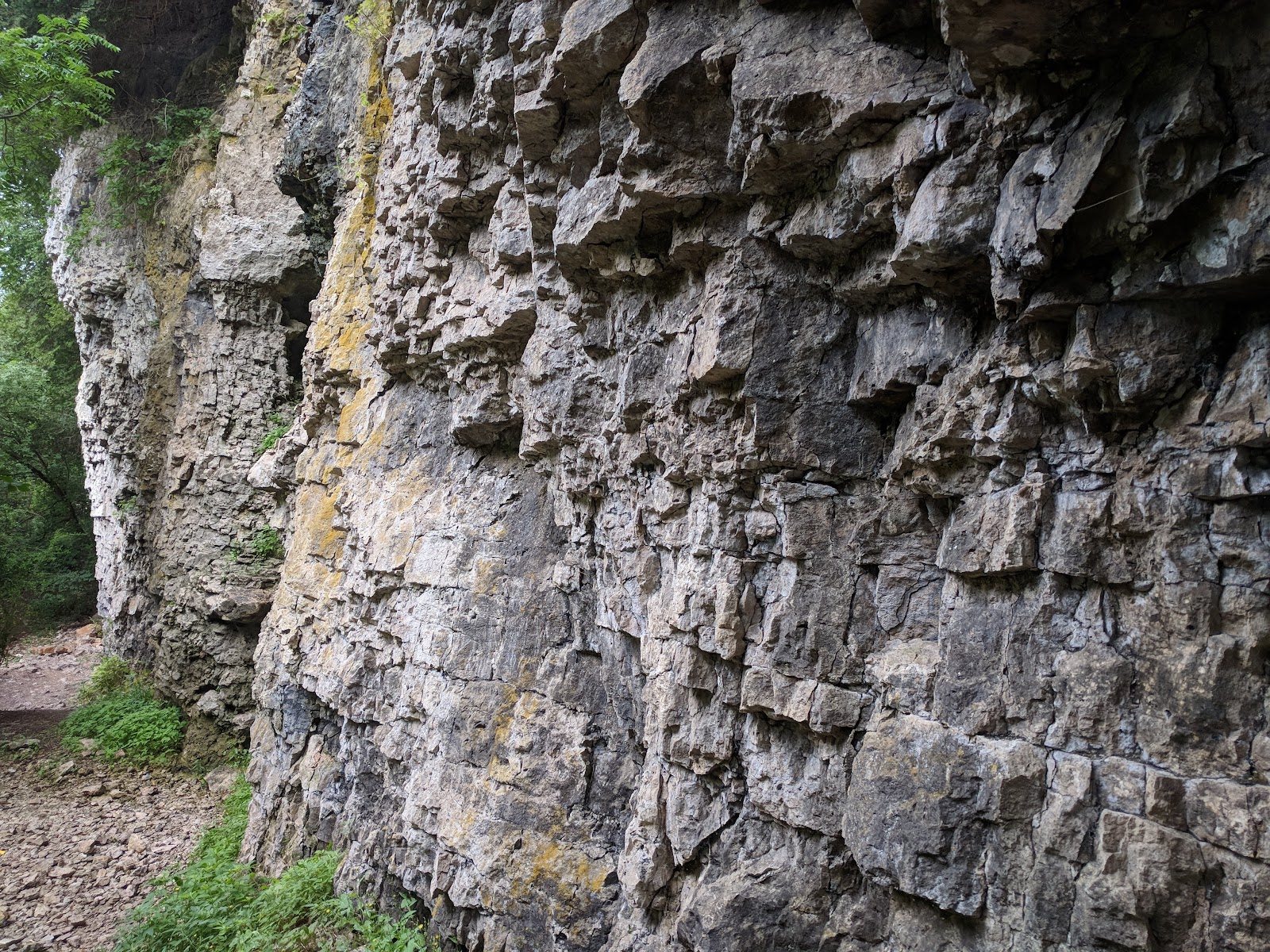 above is a part of the limestone cliff. he flowing river has literally gored through the limestone with millions of years flowing I think. The width of the space where the river flows clearly shows how much rock has been gorged away over the years!
